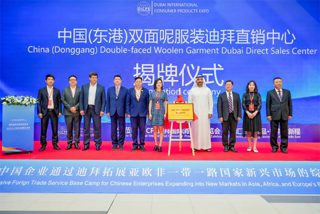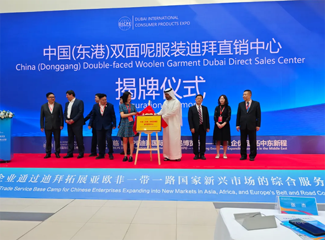 2025 年 11 月 25 日,迪拜国际消费品博览会暨迪拜中国嘉兴优品品牌出海展览会在阿联酋迪拜义乌市场隆重开幕。本次博览会以“透视中东,破局出海”为主题,致力于搭建全球消费品交流与合作的高端平台,助力中国消费品产业在亚非欧“一带一路”国家新兴市场的发展。开幕式上, 东港双面呢服装迪拜直销中心正式揭牌。成为东港双面呢服装产业突破国内市场边界、深度布局中东及全球市场的全新起点,也为东港双面呢服装产业发展按下了国际化的 “加速键”。