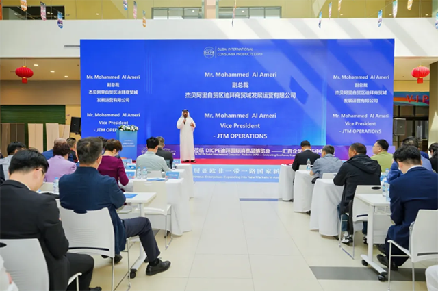 Mr. Mohammed Al Ameri详细介绍了迪拜义乌市场的运作情况,强调了其地理环境优势。迪拜义乌市场地处迪拜优越的地理位置,凭借开放的商业环境与卓越的全球连通性,为商家和公司提供了巨大的贸易便利。市场不仅为企业提供了展示产品、拓展市场的平台,还提供了丰富的贸易配对、商务洽谈等服务,帮助企业更好地对接客户、达成合作。