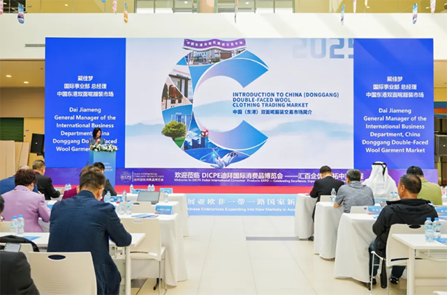 2025 年 11 月 25 日,迪拜国际消费品博览会暨迪拜中国嘉兴优品品牌出海展览会在阿联酋迪拜义乌市场隆重开幕。本次博览会以“透视中东,破局出海”为主题,致力于搭建全球消费品交流与合作的高端平台,助力中国消费品产业在亚非欧“一带一路”国家新兴市场的发展。开幕式上, 东港双面呢服装迪拜直销中心正式揭牌。成为东港双面呢服装产业突破国内市场边界、深度布局中东及全球市场的全新起点,也为东港双面呢服装产业发展按下了国际化的 “加速键”。